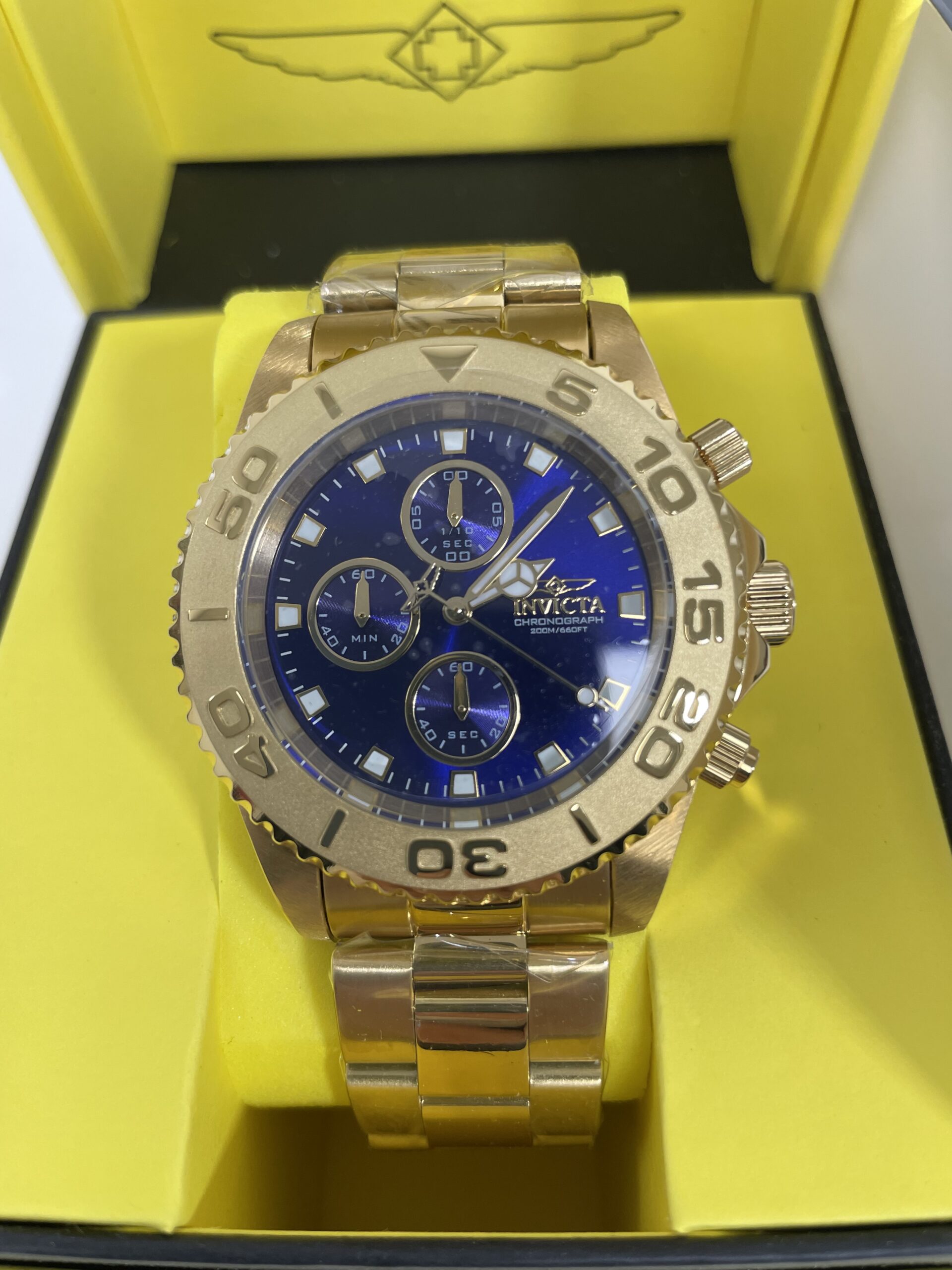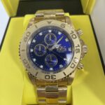 Este impressionante relógio Invicta da coleção Invicta Connection é movido por um preciso movimento de quartzo e possui caixa dourada. Seu mostrador é decorado com um mostrador azul metálico e protegido por um resistente cristal Flame Fusion. Uma pulseira de aço inoxidável dourada completa este relógio, que é resistente à água até 200 metros.