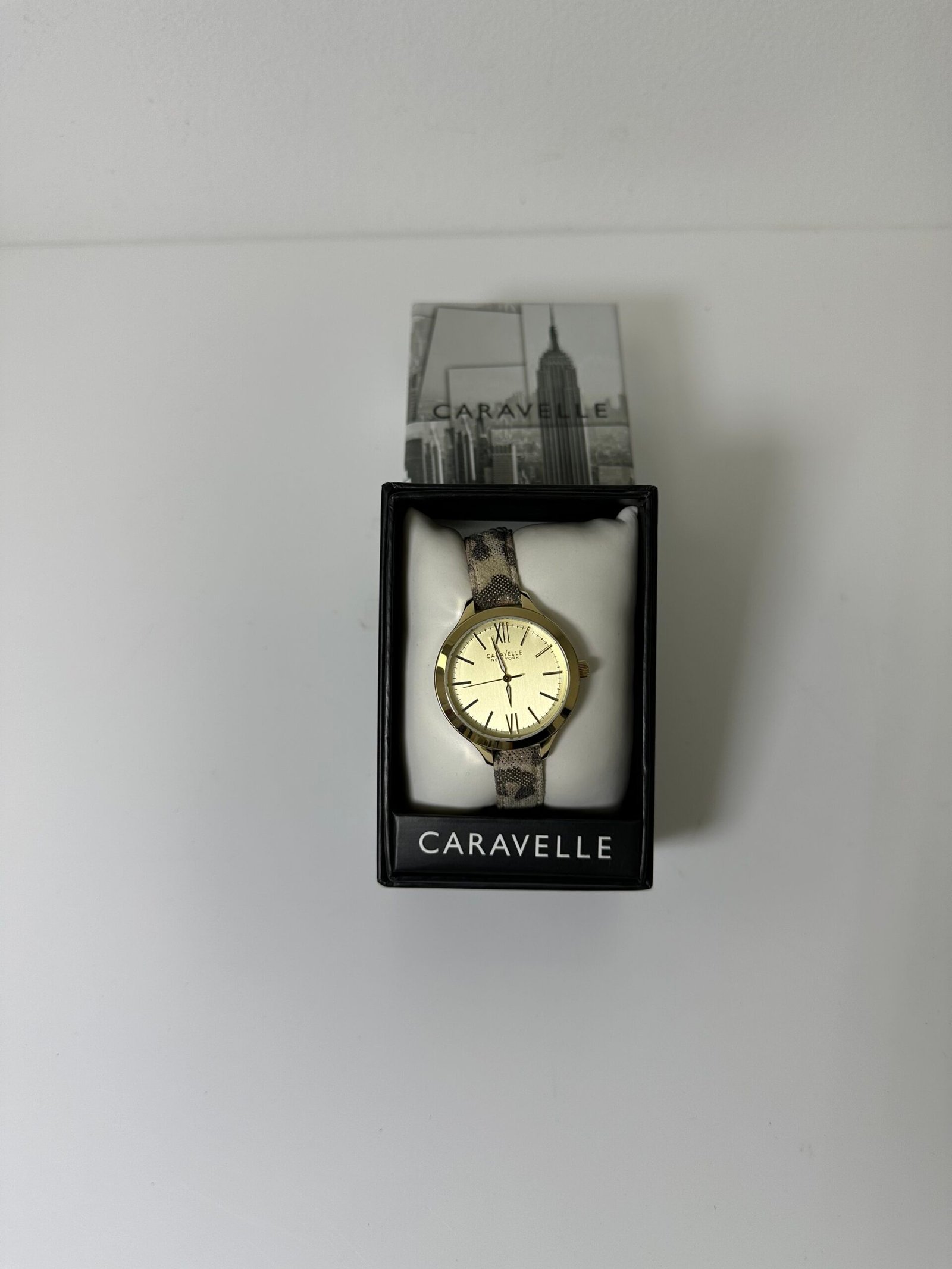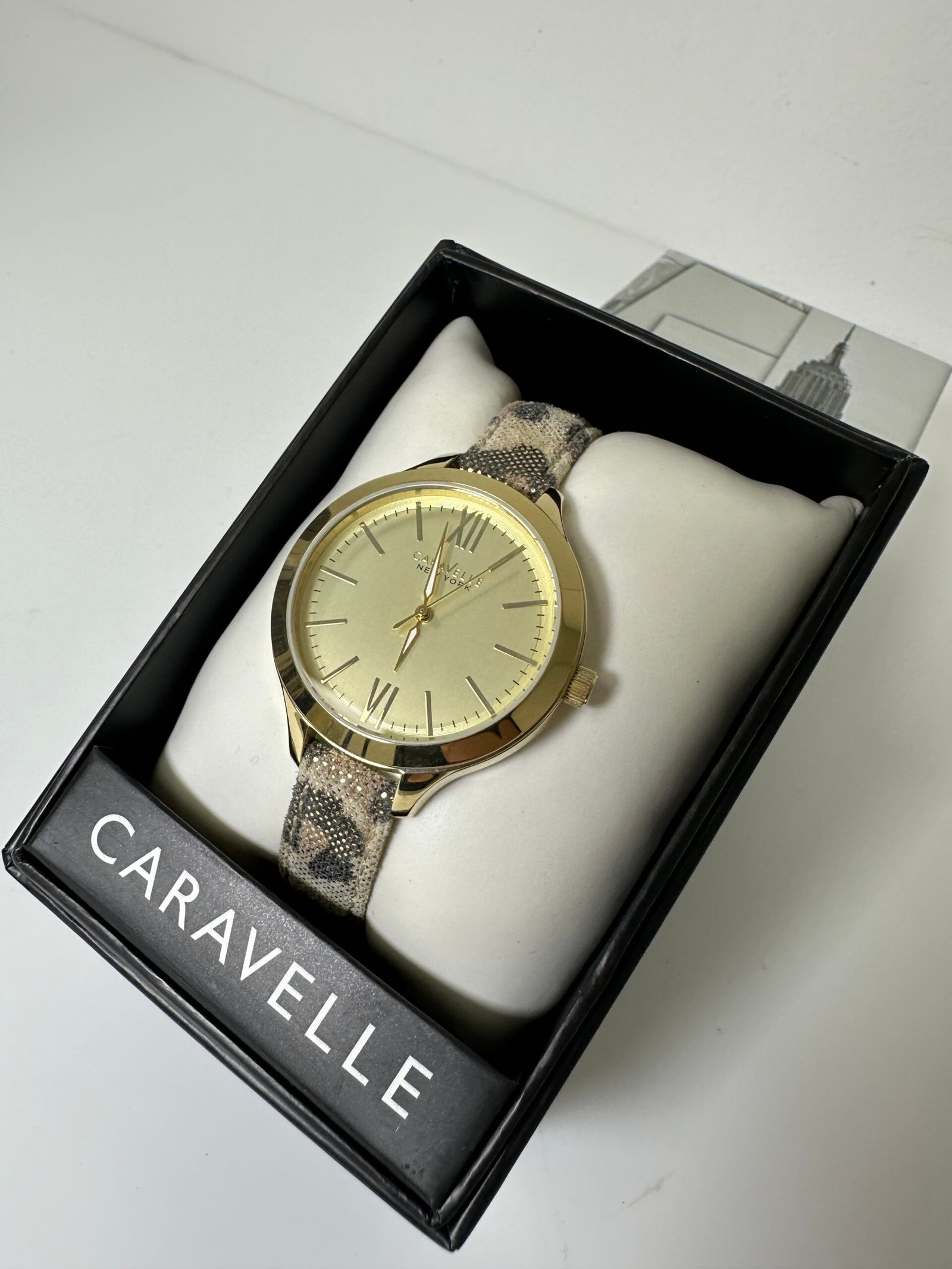 Caravelle Ladies New York Carla Watch 44L161 é um relógio de aço inoxidável com acabamento dourado suave e pulseira de couro com estampa de leopardo metálica. Os melhores relógios Caravelle New York para suas atividades diárias